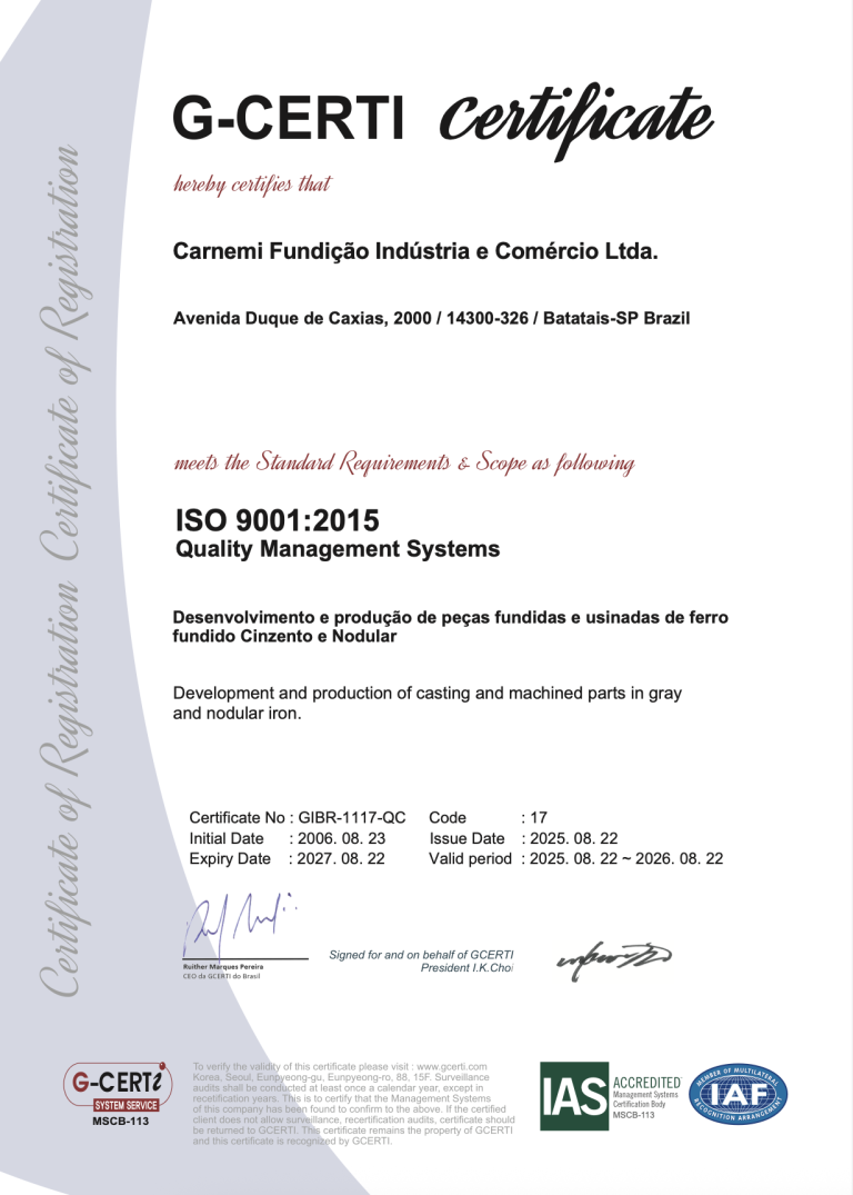 Com certificação ISO 9001-2015 implementada e IATF 16949 em implementação, contamos com um laboratório completo de análises físicas e metalográficas para o controle de nossos processos internos e das características de nossos produtos. Ensaios de areia como RCV, RCC, permeabilidade, compactação, granulometria, teor de finos, argila ativa, dentre outros e análises metalúrgicas como espectrometria por emissão óptica, dureza, alongamento, resistência a tração, limite de escoamento e metalografia fazem parte dos ensaios realizados constantemente pela nossa equipe com o objetivo de atendermos às propriedades mecânicas de nossos produtos. Paralelamente a este rigoroso acompanhamento, nossa equipe de metrologia tem à sua disposição equipamentos de medição tridimensional (CMM) para controle das características dimensionais dos produtos.
